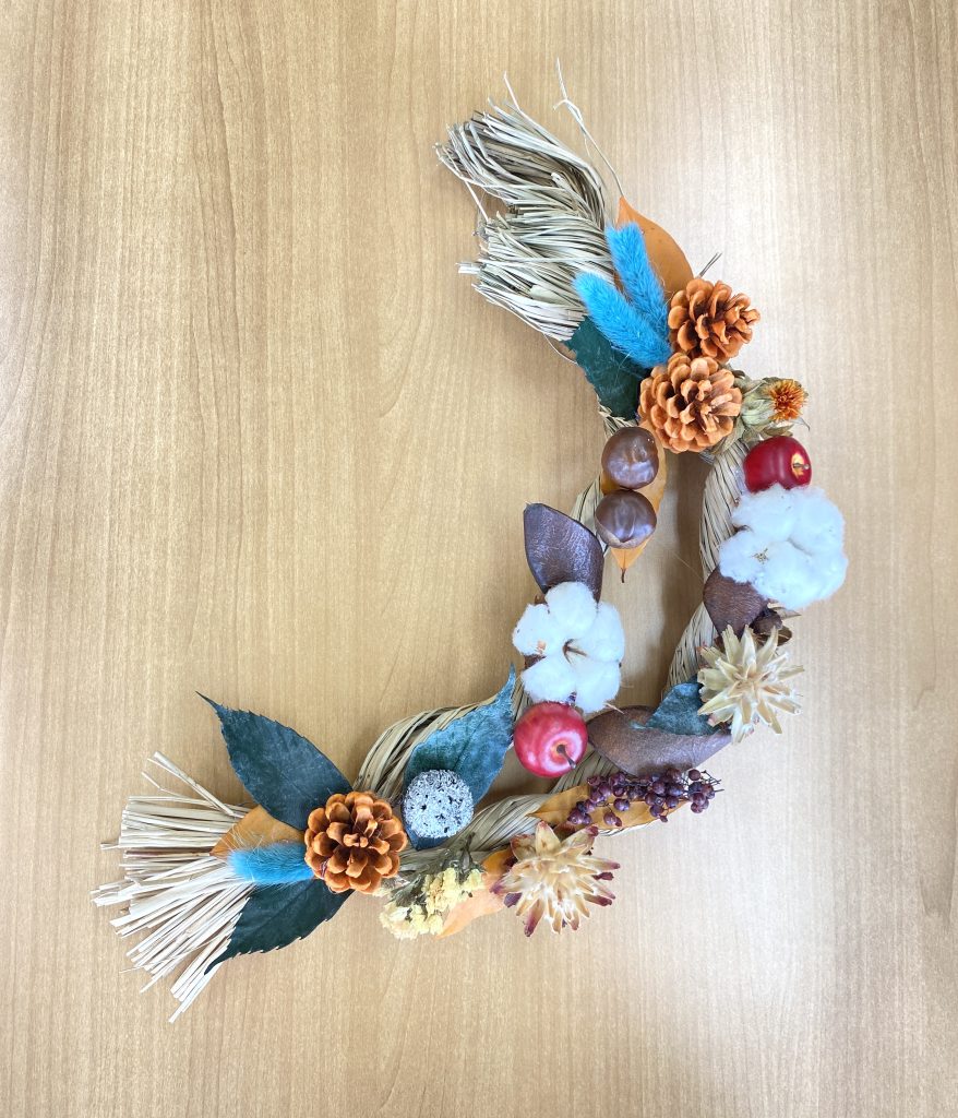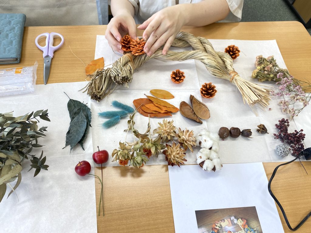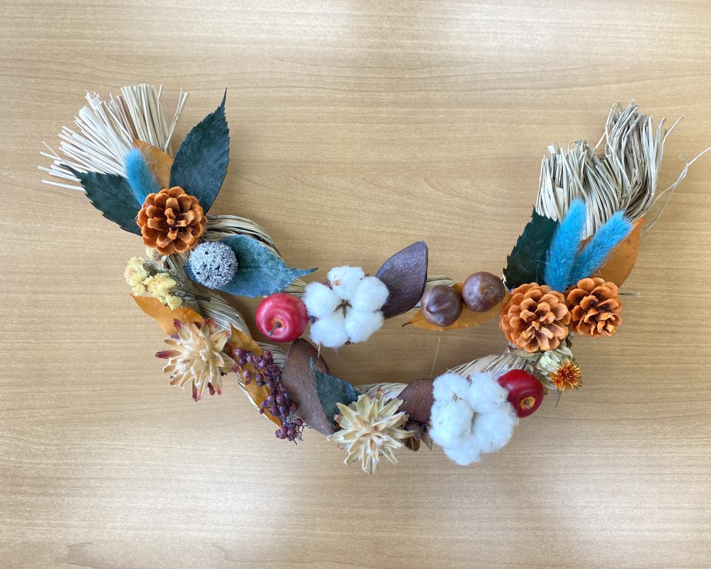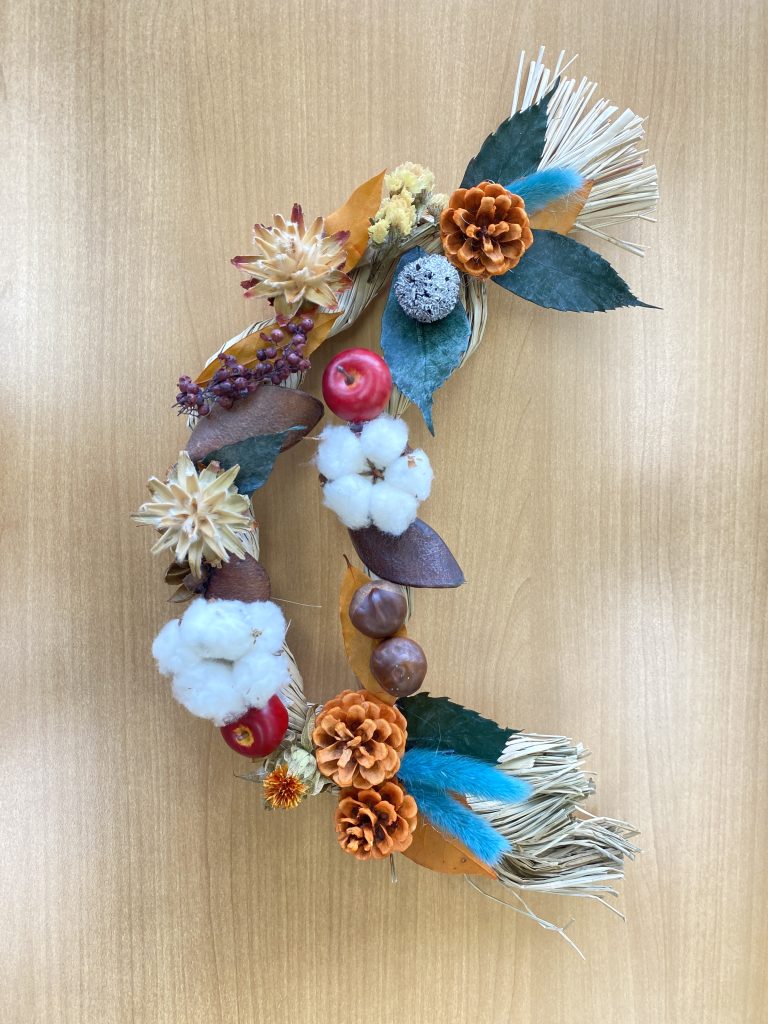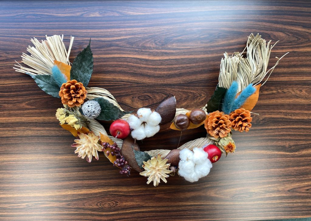 土台作りから始め、季節のドライフラワーをふんだんにデコレーションしていただきました。