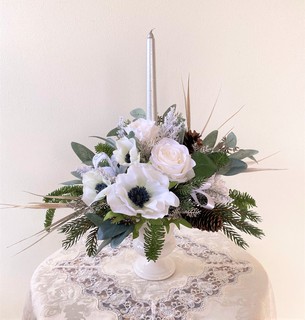 ホワイトクリスマスをイメージした白薔薇を使った作品です。