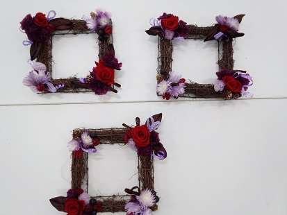 生徒作品。プリザーブドフラワー、ドライフラワーなどの自然素材を使って夏のリースを作ります。