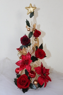 プリザのヒバ、杉、ヒイラギを土台にして、赤のバラ、金のオーナメントでデコレーション。