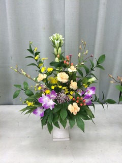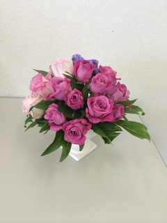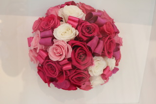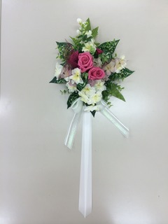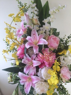 お玄関にお飾りになられる作品です。ピンクのバラ、蘭でエレガントさを出してみました。