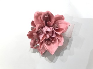 コサージュは正確に制作するのは意外と難しいです。フックが付いているので、お好きな物をかけていただけます。