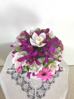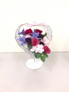 カーネーション、バンダ、スイートピー、ブルニア、千日紅を使ってハートのシェイプに仕上げていただきました。
