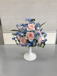 アーティフィシャルフラワーの中にプリザーブドフラワーのバラを入れた作品は、やはりとても華やかです。