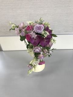 お生花のレッスンはベーシックコース終了試験の「ウェディングポージ」、「エドワジアンブーケ」